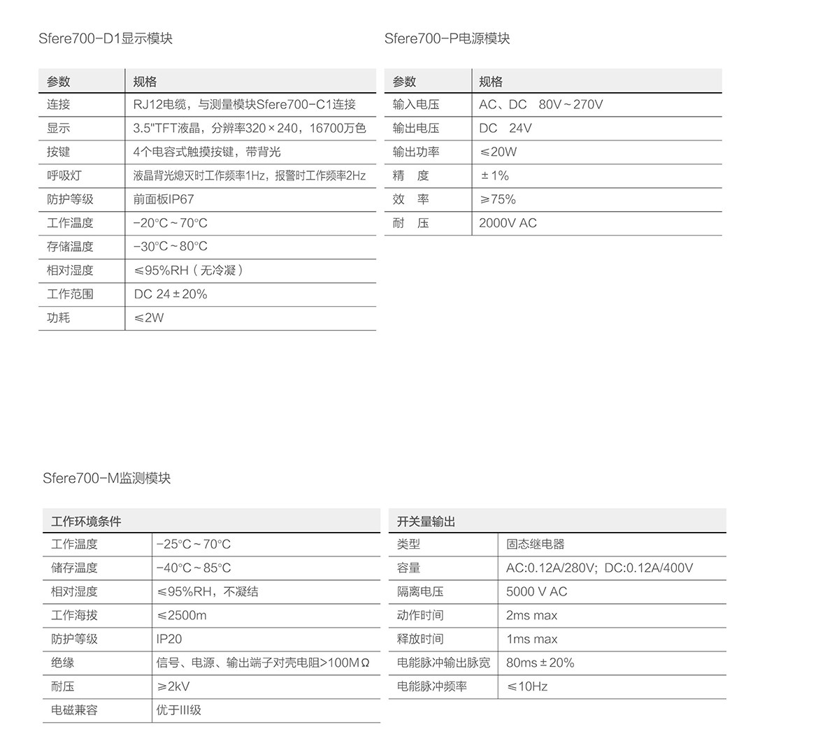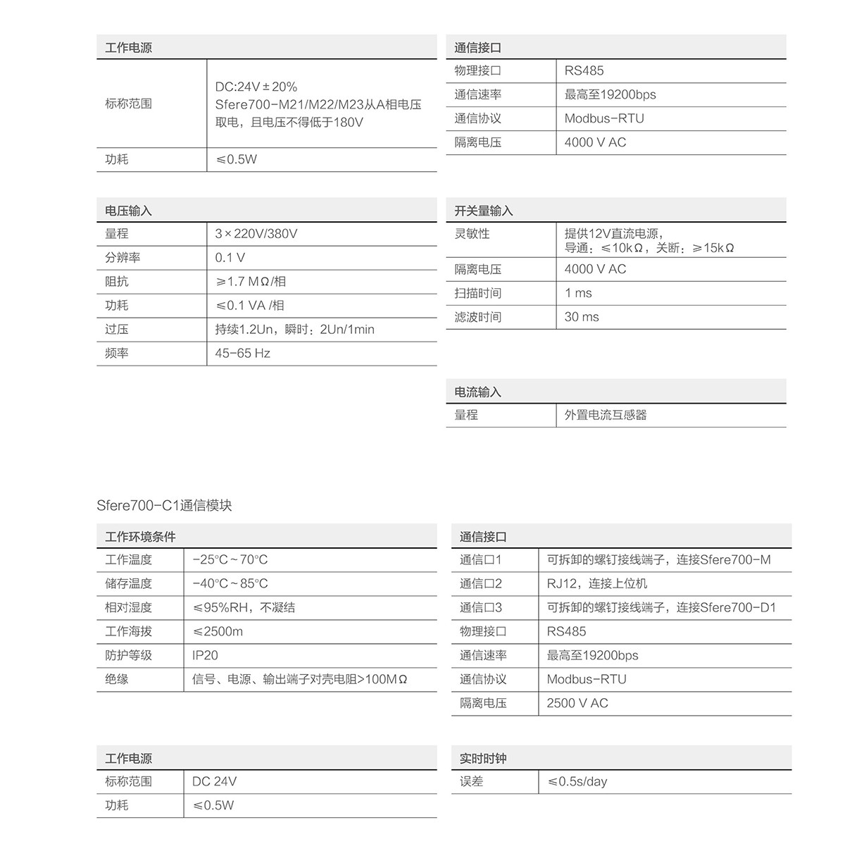 Sfere700监测单元可实现低压配电系统电力参数的实时测量、电能计量、电能质量分析、状态监测及越限报警等功能,Sfere700包含1个显示模块Sfere700-D1、一个通信模Sfere700-C1、一个电源模块Sfere700-P、最多支持32个监测模块Sfere700-M,以及配套的电流互感器等。可实现最多32个三相回路电力参数的测量。配备超大的彩色液晶显示屏和触模式按键,使用简易,其体积紧凑,安装便捷,是多回路电力监测的理想方案。