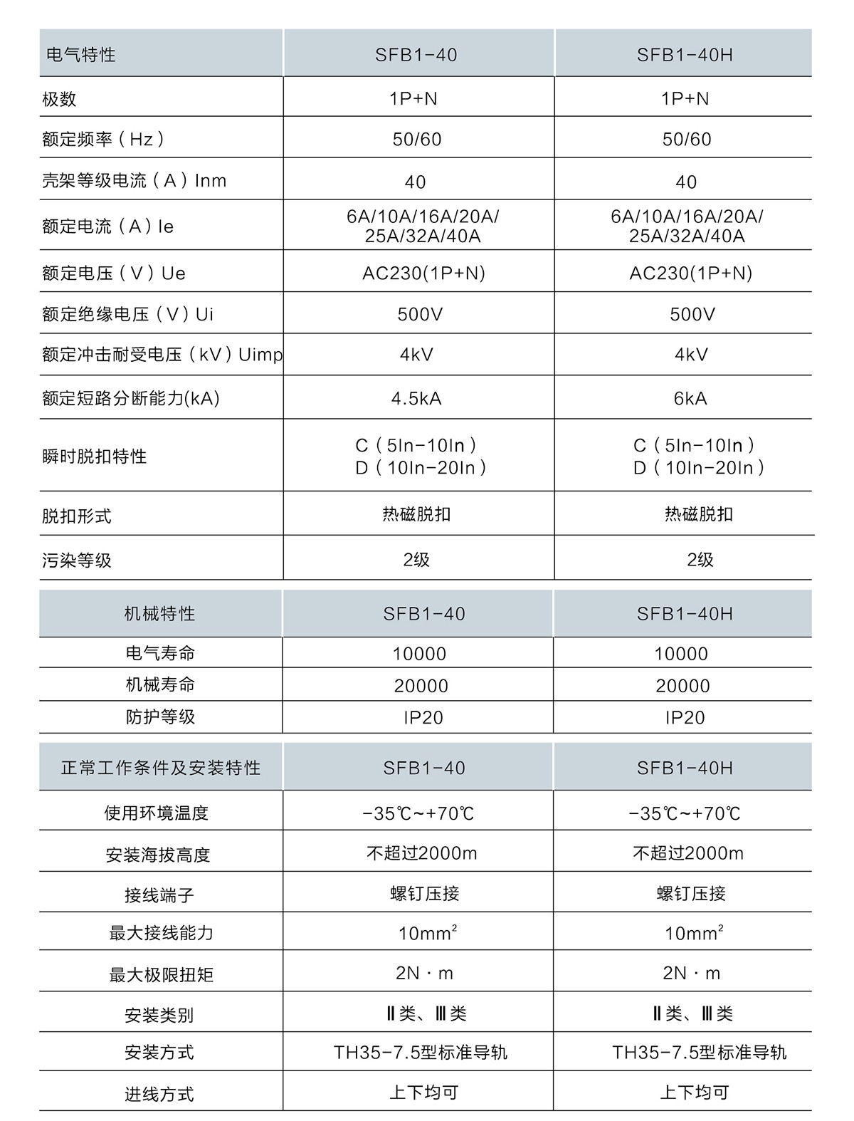 SFB1-40系列小型断路器适用于交流50Hz成600Hz,额定工作电压230V,额定电流6A-40A的线路中,对电路过载和短路进行保护,是目前住宅领域最理想的配电保护器。