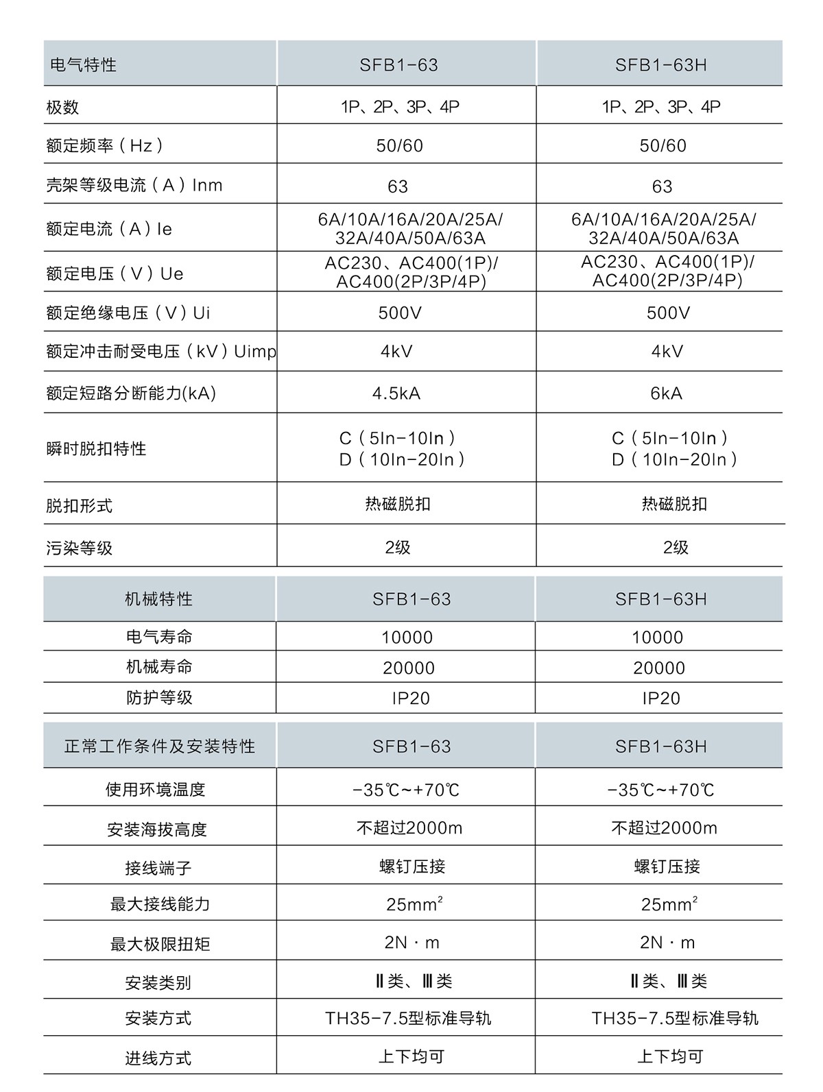 SFB1-63系列小型断路器适用于交流50Hz或60Hz,顺定电压为400V及以下,颜定电流6A-63A的场所。主要用于办公楼、住宅和类似的建筑物的照明、配电线路及设备的过赢、短路保护,也可在正常情况下,作为线路不频繁转换之用。