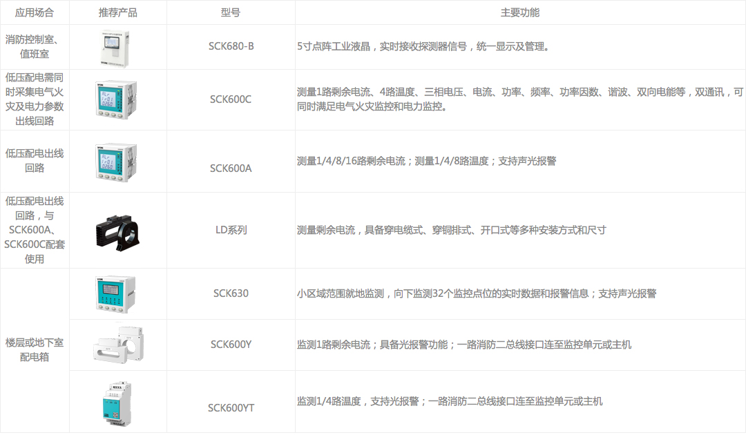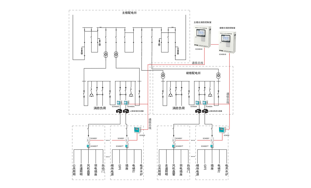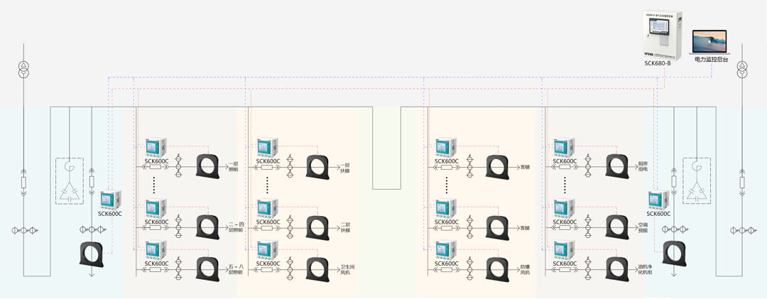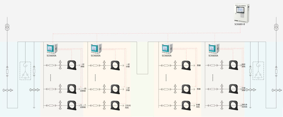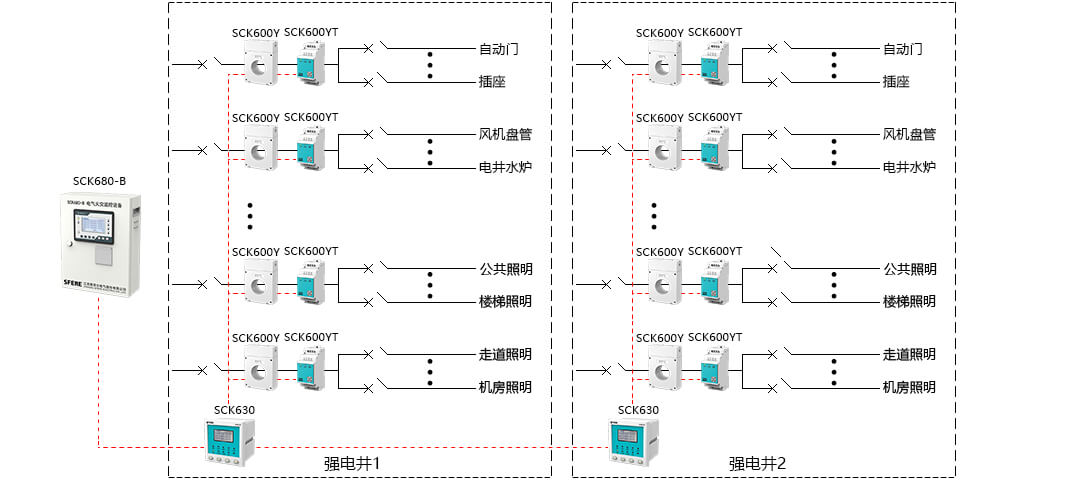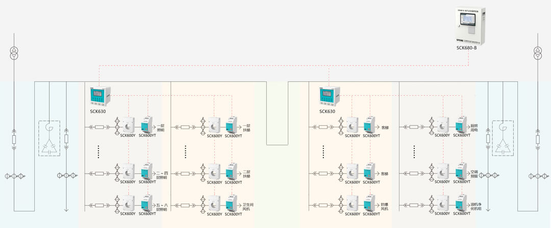 当供电线路泄漏电流大于500mA时,需在其下一级配电箱设置电气火灾监控探测器。可在每个配电箱内安装一个SCK600Y一体式电气火灾监控探测器、SCK600YT测温式电气火灾监控探测器和NTC温度传感器,一层楼或一个强电井配置一台SCK630监控单元。