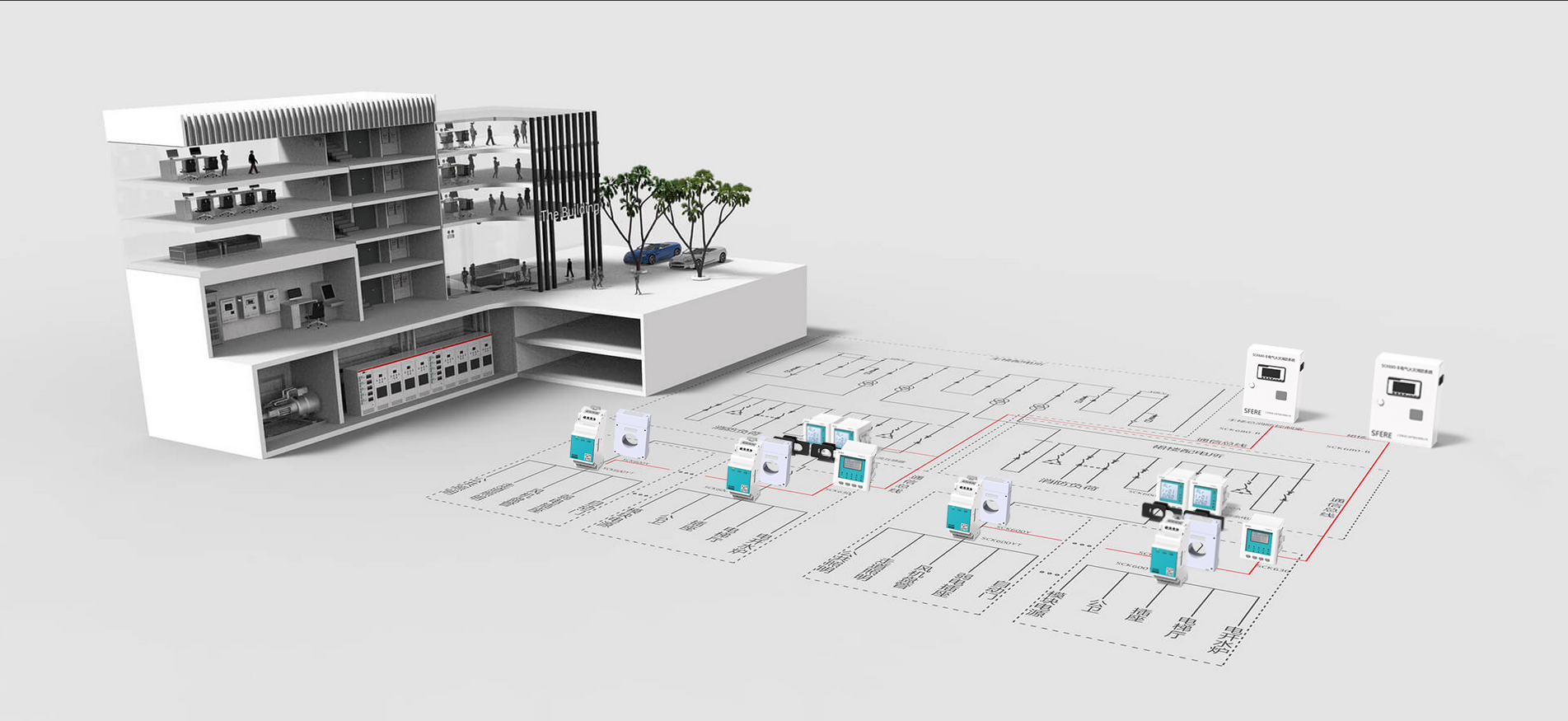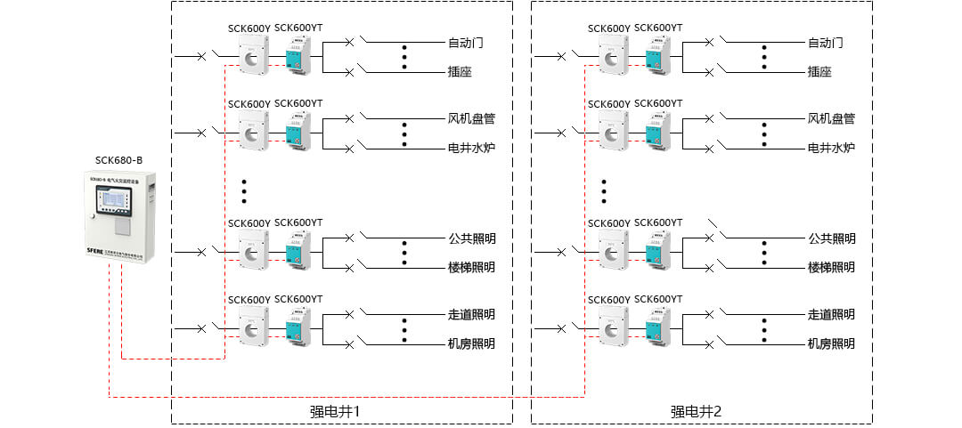 在每个配电箱内安装一个SCK600Y剩余电流式电气火灾监控探测器、SCK600YT测温式电气火灾监控探测器和NTC温度传感器,SCK600Y剩余电流式电气火灾监控探测器、SCK600YT测温式电气火灾监控探测器通讯线直接连至电气火灾监控设备。