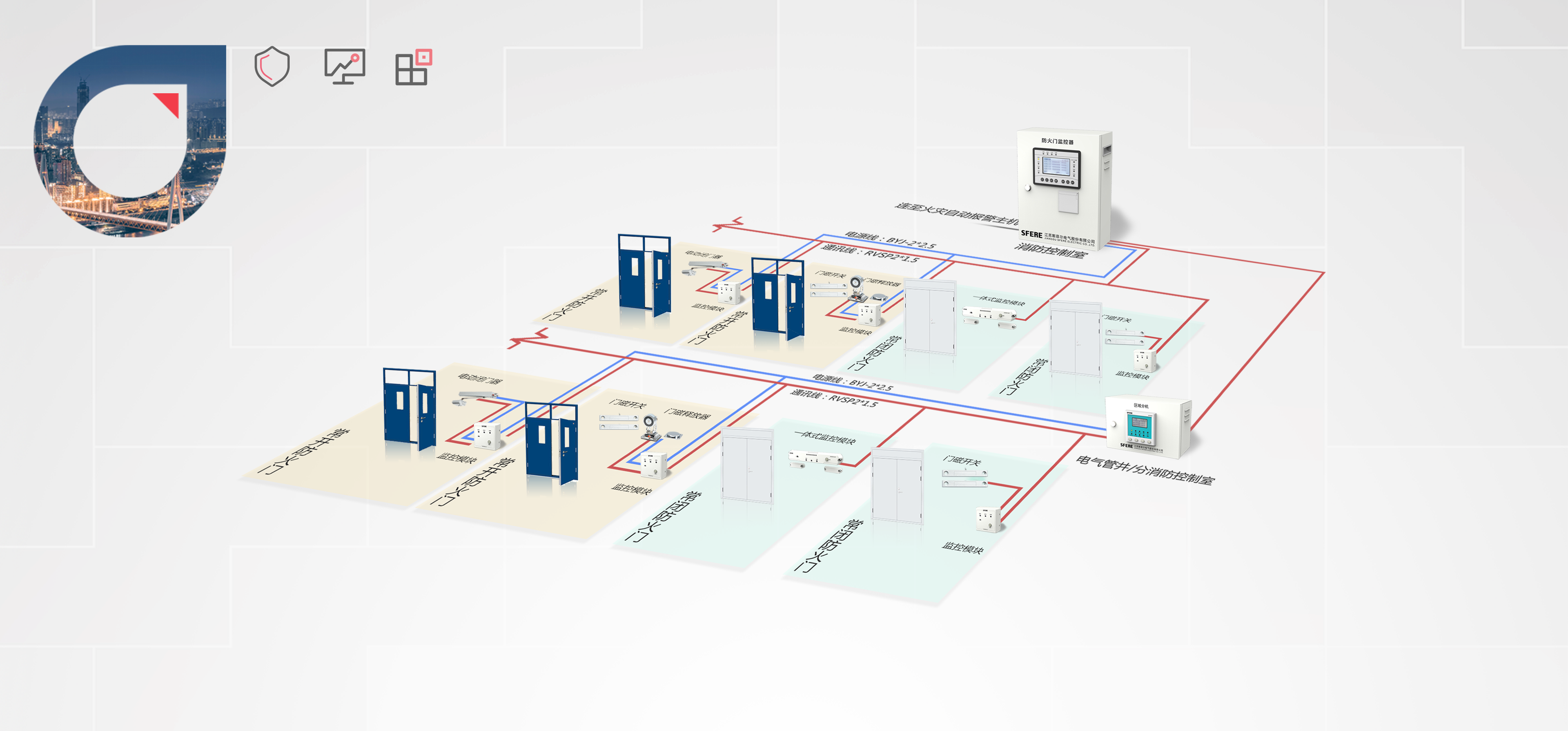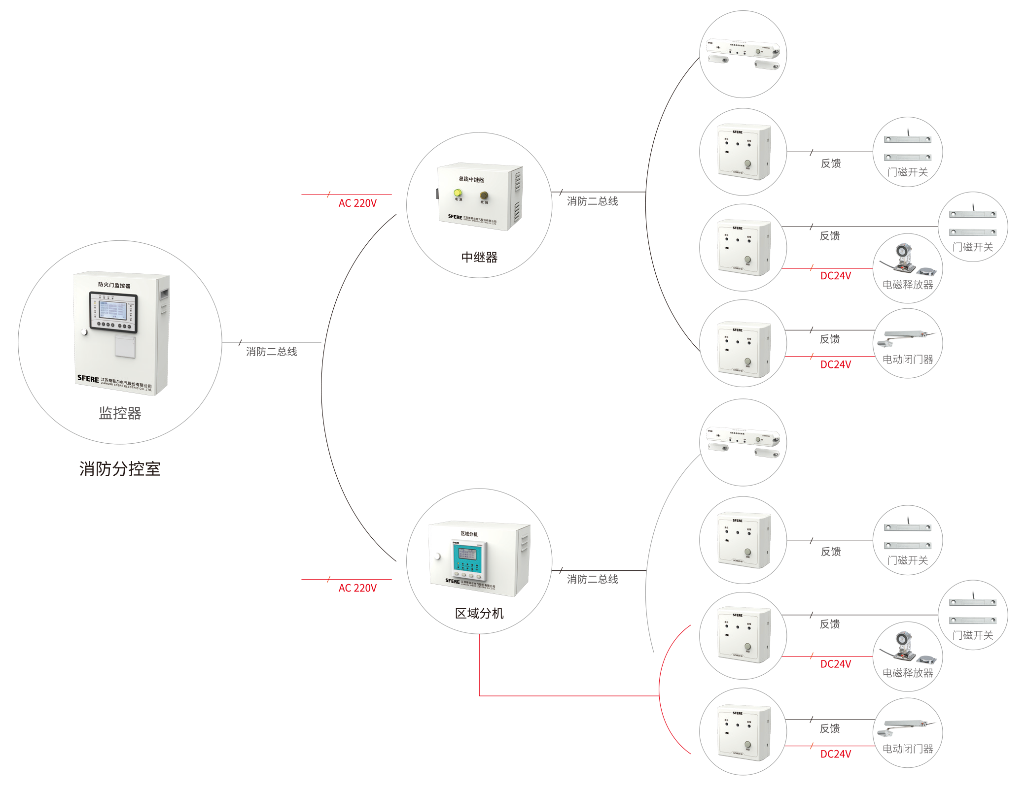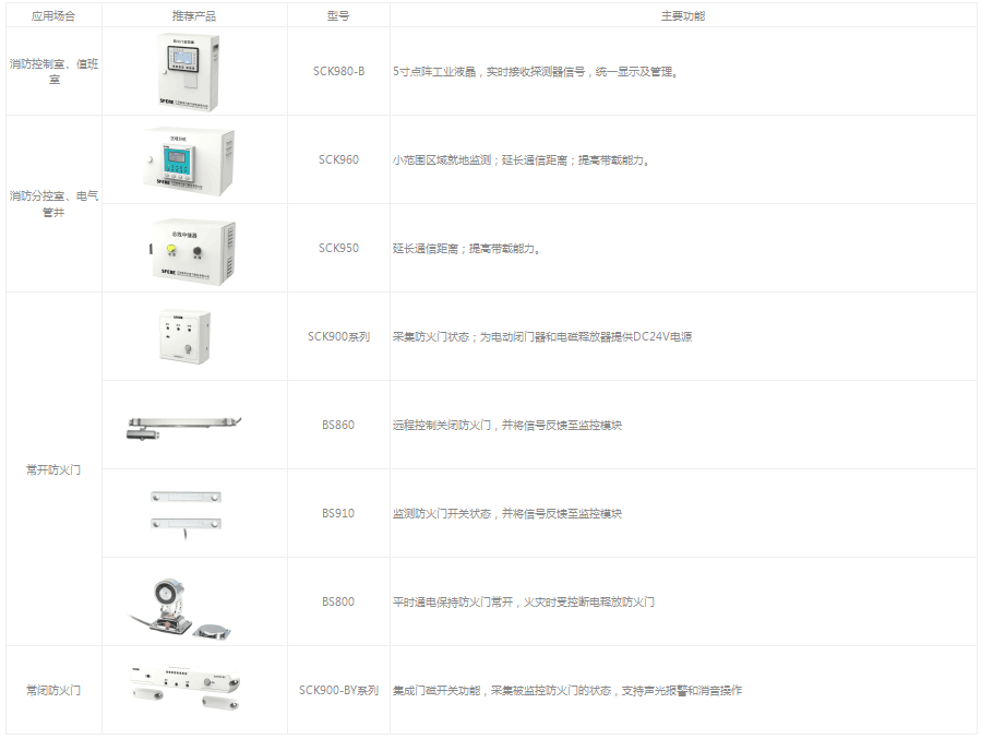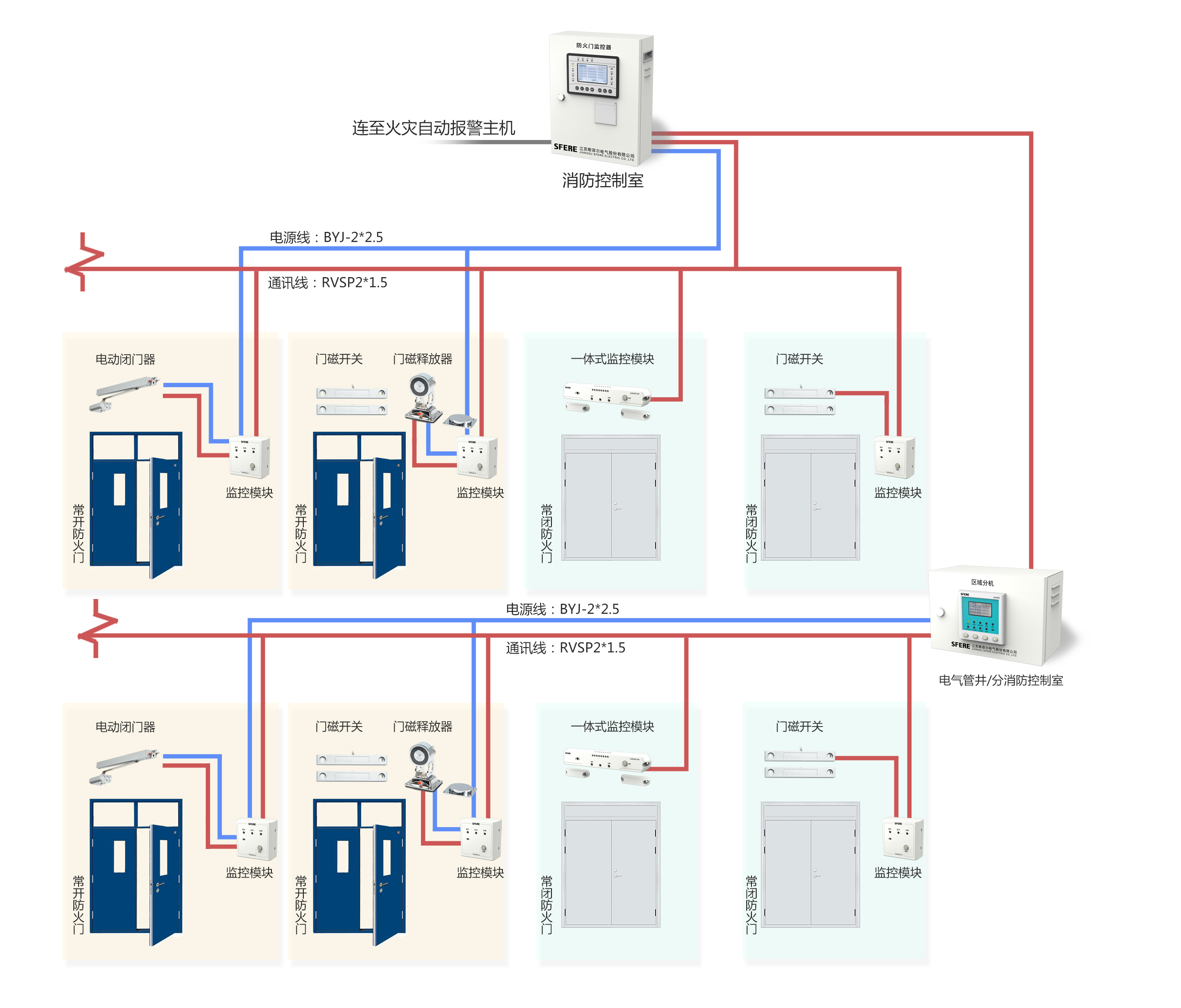 防火门监控系统由防火门监控器、区域分机、中继器、监控模块、门磁开关、电磁释放器、电动闭门器、机械闭门器等设备组成。
