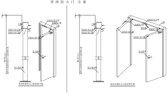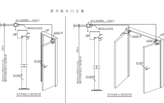 常开门采用分体式监控模块和电动闭门器方案,即双扇常开防火门在左右两扇门门框处各安装一台BS860电动闭门器,在门旁墙体上安装一个SCK920-K防火门监控模块;单扇常开防火门在门框处安装一台BS860电动闭门器,在门旁墙体上安装一个SCK910-K防火门监控模块。