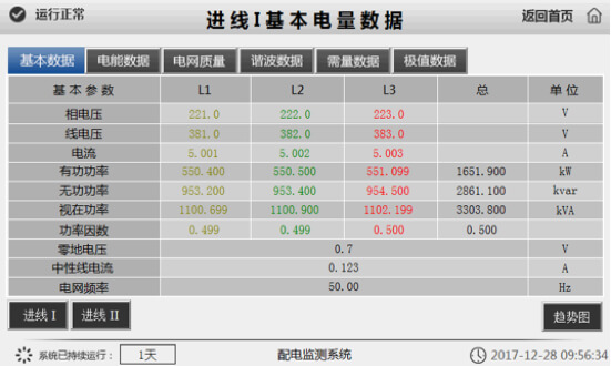 实时监测进、馈线基本数据,包括电压、电流、功率、功率因数、频率、电能数据、电网质量、谐波、需量、极值等。