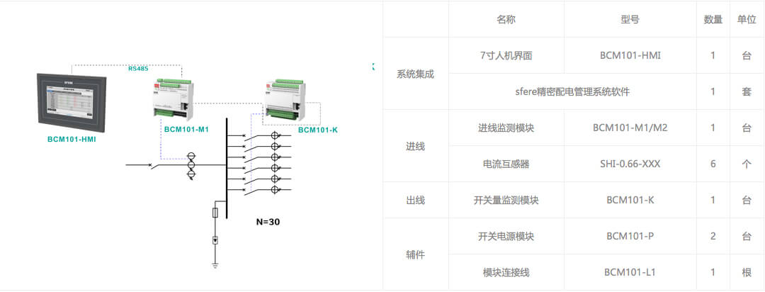 进线回路采用BCM101-M1模块,监测1路三相进线回路,出线回路配置1个BCM101-K开关量监测模块(最大可监测60个出线回路)。实现对进线电参量基本电量数据、电能数据、电网质量、谐波数据、需量数据、极值数据及出线回路开关状态监测。