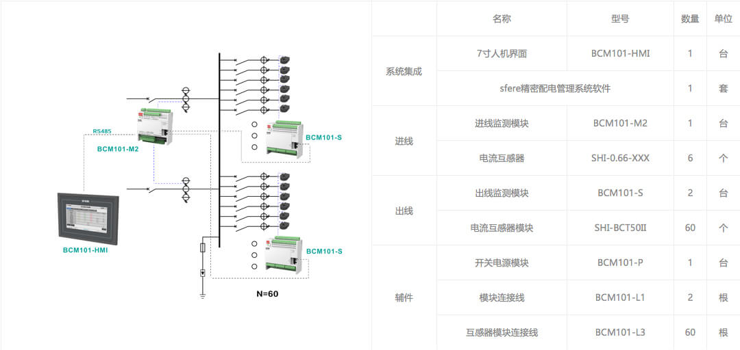 进线回路采用BCM101-M2模块,监测两路三相进线回路,出线回路配置2个BCM101-S模块(最大可监测60个出线回路)。实现对进线及出线各回路电参量基本电量数据、电能数据、电网质量、谐波数据、需量数据、极值数据及越限告警等功能。