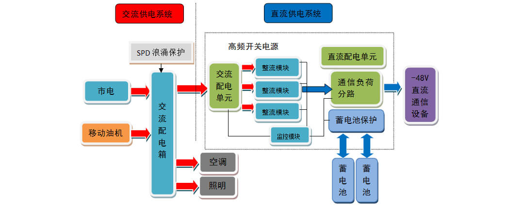 基站供电系统主要由交流供电系统和直流供电系统组成。交流供电系统:由一路市电电源、一路移动油机电源、浪涌保护器、交流配电箱(具备市电油机转换功能)组成。直流供电系统:由高频开关组合电源(含交流配电单元、监控模块、整流模块、直流配电单元)、两组(或一组)蓄电池组成。