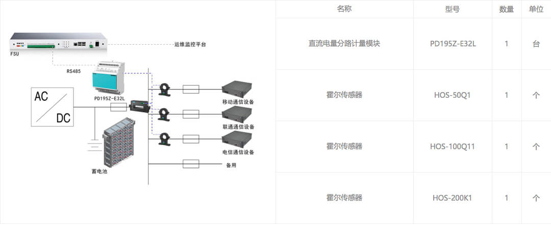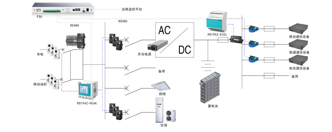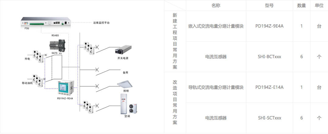 基站内的开关电源、空调、照明以及插座都由交流配电箱进行供电,并通过多回路交流表计实现高精度分路测量,而基站内各类通信设备主要是由直流系统进行供电,利用直流电量分路计量设备对不同运营商的通信设备实现能耗监测,最终都通过FSU设备接至运维监控平台,实现对通信基站能耗的有效监测及运营管理。